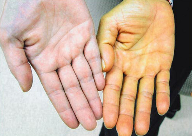 Найбільш поширеним симптомом гострих і хронічних форм гепатиту є жовтушність шкіри та склер, яка виникає, коли білірубін, що не перероблений в печінці, потрапляє в кров і надає шкірі характерний жовтуватий відтінок. Нерідко гепатити супроводжуються шкірним свербежем, появою на шкірі висипу, невротичними симптомами, брадикардією. Крім того характерний розвиток таких синдромів як: астеновегетативний (слабкість, розлад сну, підвищена стомлюваність, емоційна лабільність); больовий ( біль в правому підребер’ї, що посилюється при фізичних навантаженнях і при зміні режиму харчування); диспепсичний (нудота, блювота, метеоризм, зниження апетиту, пронос, закреп); геморагічний (схильність до утворення синців, петехії, маткові кровотечі). При гепатитах може спостерігатися субфебрилітет, почервоніння долонь, гепатомегалія (збільшення печінки).