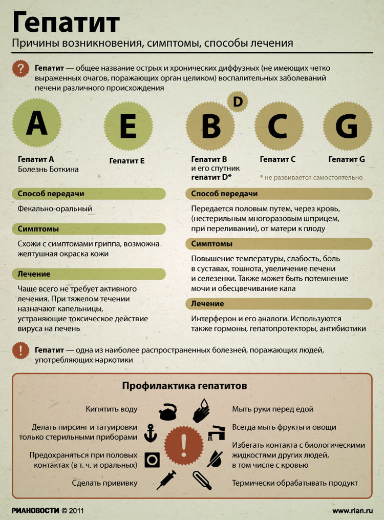 Гепатит — це запальне захворювання печінки, частіше вірусного походження (гепатит A, В, С, D, E, F, G). Крім того гепатити бувають: бактеріальні (при амебіазі, токсоплазмозі, опісторхозі, шистосомозі); токсичні (алкогольний гепатит, медикаментозний гепатит, гепатити при отруєнні різними хімічними речовинами); променеві (компонент променевої хвороби); аутоімунні та ішемічні гепатити.