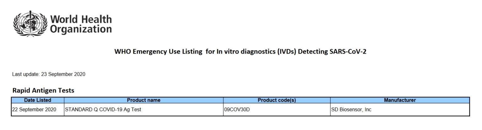 В даний час тести STANDARD Q COVID-19 Ag знаходиться на завершальній стадії затвердження у комітеті надзвичайних ситуацій Управління з продовольства і медикаментів США (FDA).